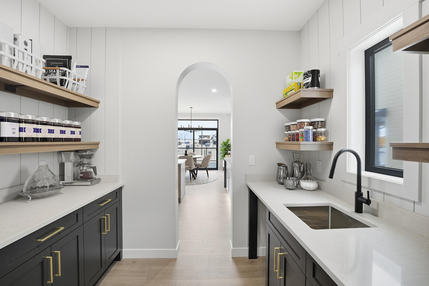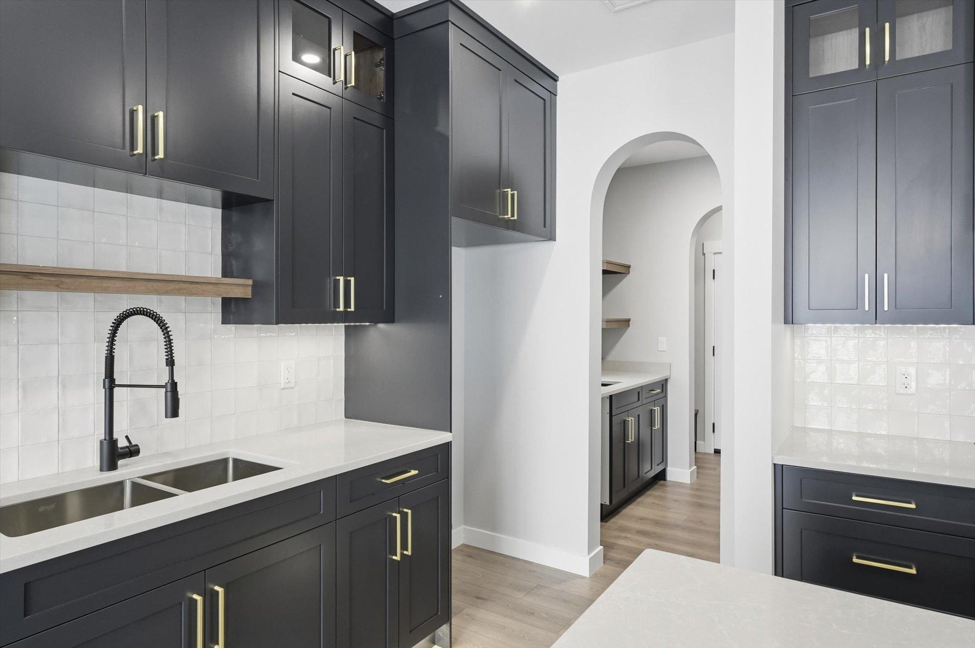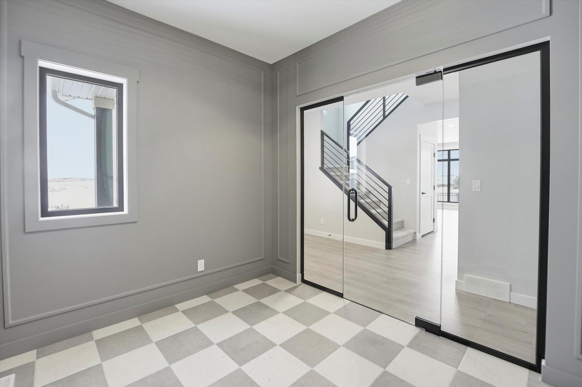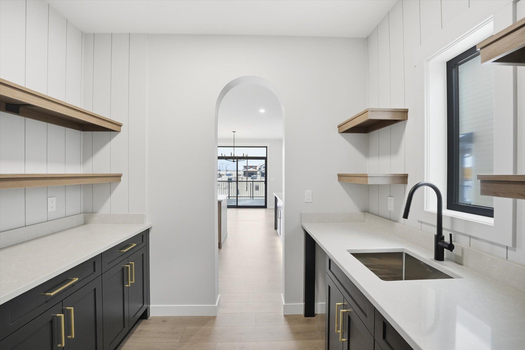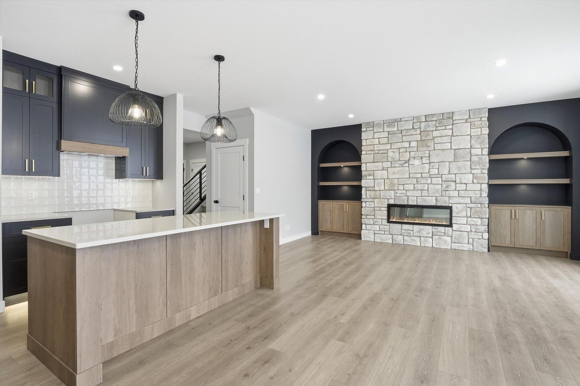 Entering the home from the insulated and boarded garage, you step into the mud room area, with bench and locker area for a quick disposal of outerwear. The mudroom is conveniently attached to the walk through pantry containing Tafisa shelving and brackets for ample storage of your groceries. This home also features a spice kitchen in the pantry with a sink, window and a lower bank of cabinets. This area is great for a coffee bar and extra prep area. Entering the kitchen, you will find beautiful cabinets to ceiling including an oversized island, undermount lighting, backsplash tile and quartz countertops. The great room features large windows, and oversize patio door for an abundance of natural light, and the fireplace is a stunning focal point in the room. The addition of the flex/office area adjacent to the front entrance is a perfect work from home space.
