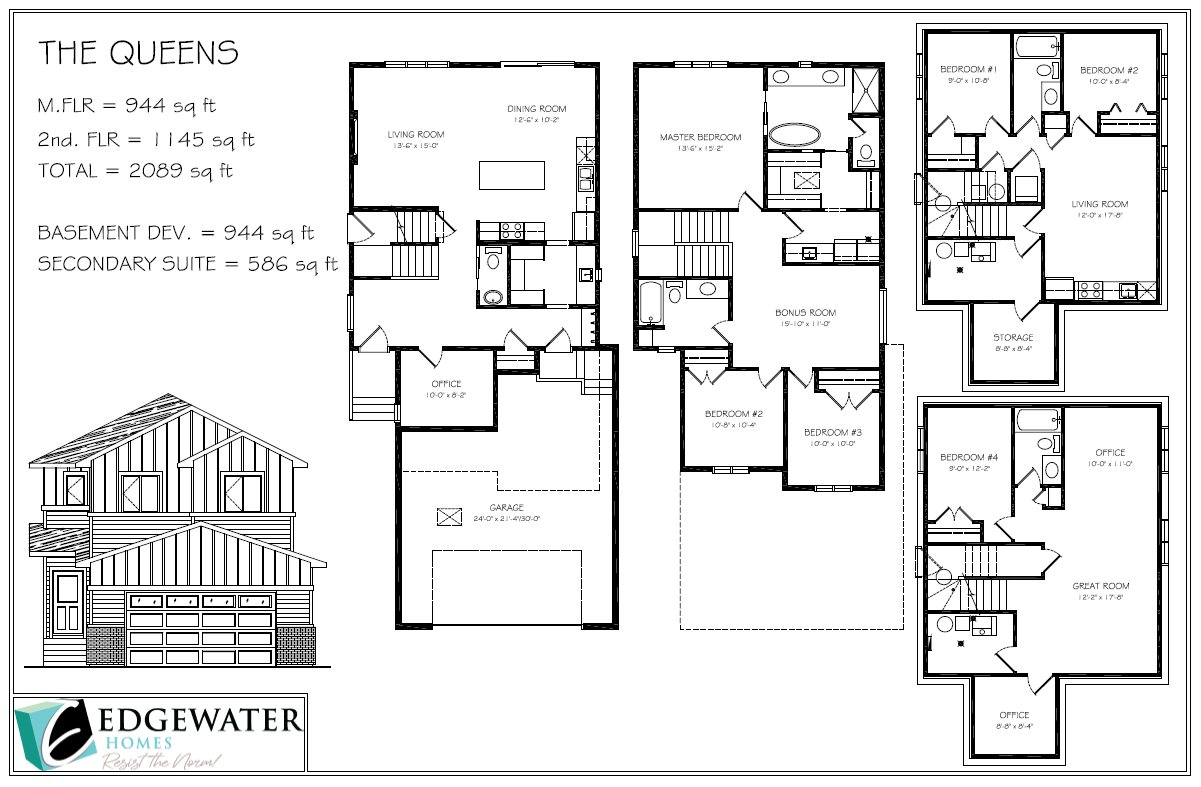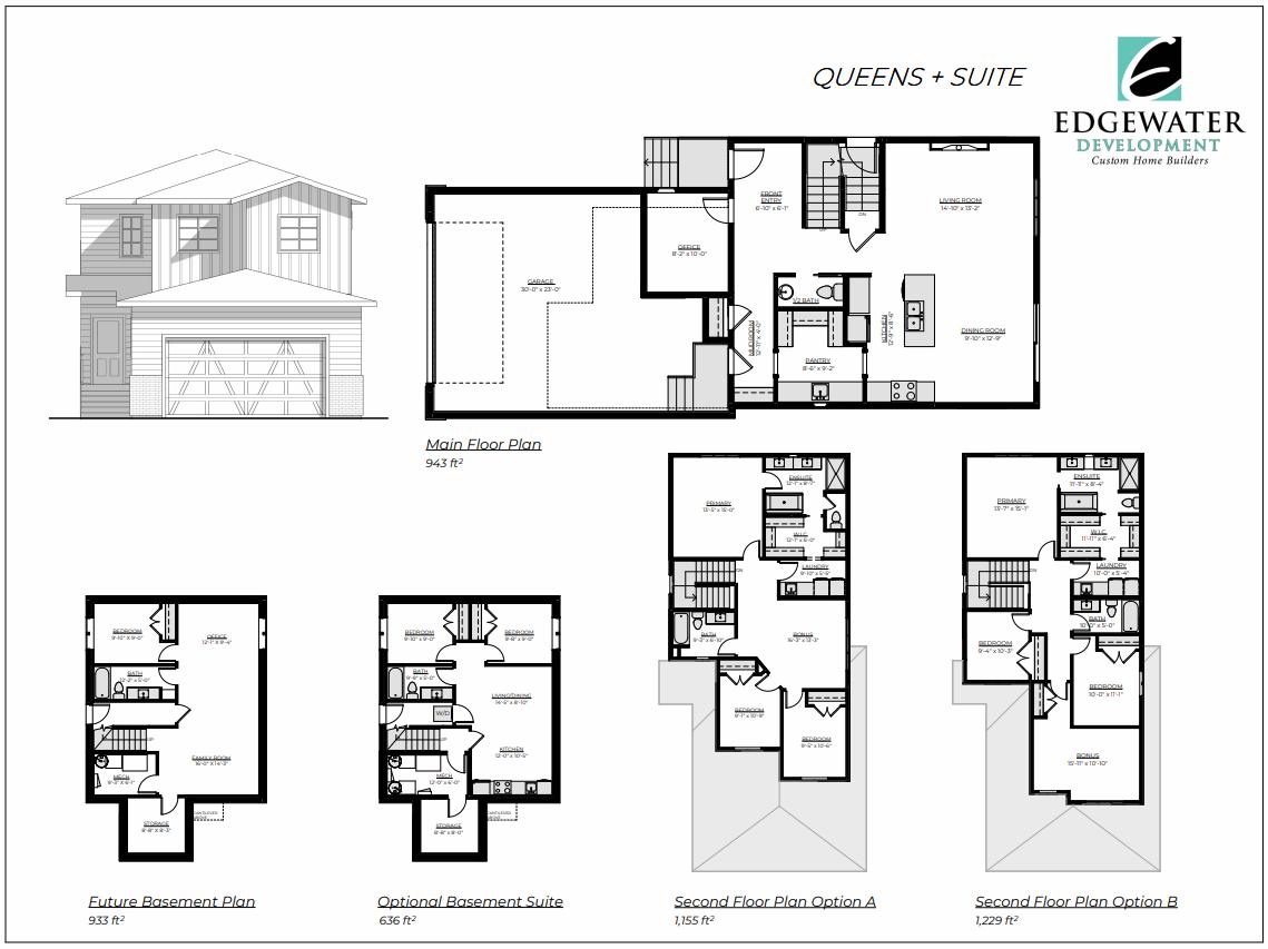 Edgewater is excited to announce a brand-new design called "The Queens" a 2088 square foot 2 storey designed around our original Escada that our homeowners love. The basement can be outfitted with infrastructure for a 2 bedroom suite. We expanded the main floor to make a more spacious living and dining room with the same exceptional attention to detail. We listened to clients requesting a flex/office area to be added to the main floor. Entering the home from the insulated and boarded garage, you step into the mud room area, with bench and locker area for a quick disposal of outerwear. The mudroom is conveniently attached to the walk through pantry containing Tafisa shelving and brackets for ample storage of your groceries. This home also features a spice kitchen in the pantry with a sink, window and a lower bank of cabinets. This area is great for a coffee bar and extra prep area. Entering the kitchen, you will find beautiful cabinets to ceiling including an oversized island, undermount lighting, backsplash tile and quartz countertops. The great room features large windows, and oversize patio door for an abundance of natural light, and the fireplace is a stunning focal point in the room. The addition of the flex/office area adjacent to the front entrance is a perfect work from home space.